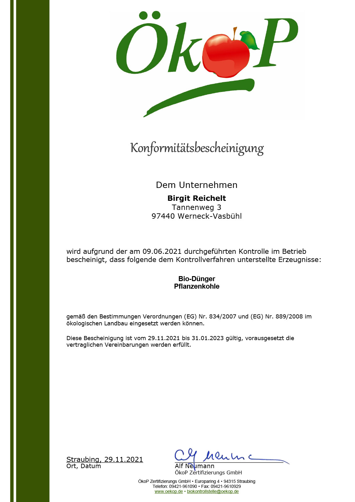 Durch die Konformitätsbescheinigung der EG-Öko-Verordnung 2021 - 2023 bescheinigt die Ökop Zertifizierungs GmbH unserem Unternehmen, dass alle unsere eigens hergestellten Produkte von Naturaferm, wie zum Beispiel Bokashi und Ergänzungsfutter, streng nach den Richtlinien der EG Öko Verordnung produziert werden.